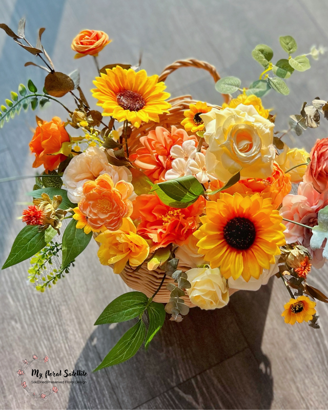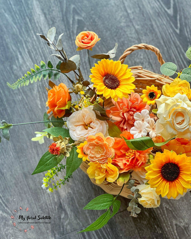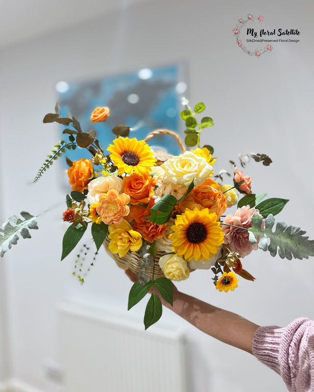 This silk flower wall piece features a vibrant sunflower at its center, paired with soft-toned preserved florals. Inspired by Korean minimalist aesthetics, it's designed to bring warmth and cheer to any wall — whether it's your bedroom, hallway, or a cosy reading nook.